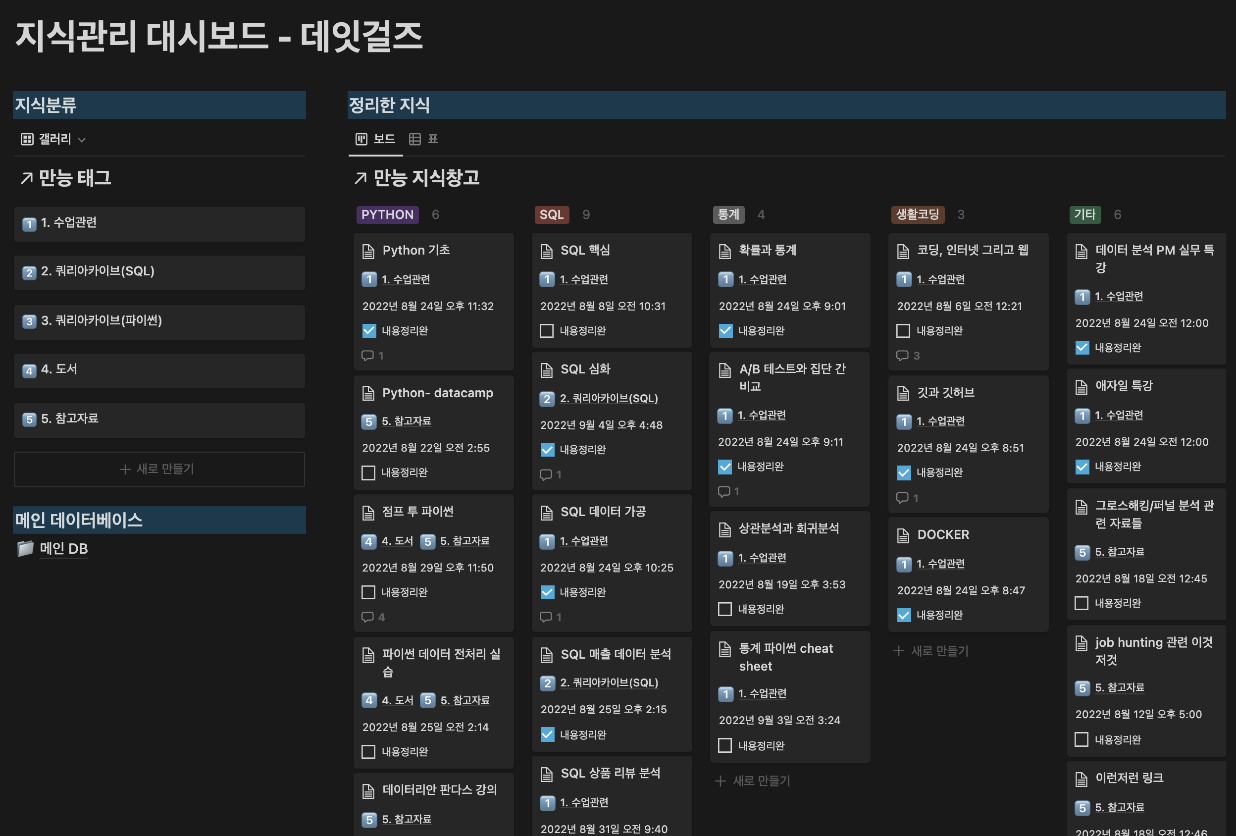 '온라인 독서실'은 그냥 내가 공부하는 방식과는 핏이 딱 맞지는 않아서 보류 중이다. 그래도 혼자서 열심히 대시보드에 지식을 쌓아가면서 복습은 하고 있다. 농부의 마음처럼 각 영역에서 쌓여가는 내용들을 보면서 혼자 흐뭇해하는 중이다. 마치 깃의 잔디심기처럼 땅따먹기에 열중하고 있다.