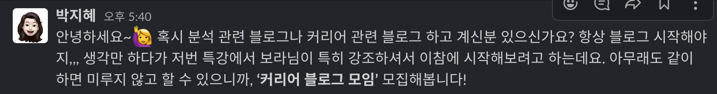 '블로그'가 사실 데잇걸즈 덕분에 하게 된, 그리고 시작하고 나서 가장 뿌듯한 세부 목표였다. 진짜 예전에 회사 다녔을 때 부터 블로그 해야지해야지 했었는데, 데잇걸즈 특강 때 커리어 블로그의 장점을 자꾸 듣다 보니 이제는 시작해야겠다 싶었다. 그래도 혼자서는 도저히 미루기만 하고 해낼 수 없을 것 같아 무작정 슬랙에 블로그 모임 모집을 해버렸다. 아직 2주 차지만 시작이 반이라고 일단 커리어 블로그를 오픈해두니 중간중간 글감이 생기면 초안을 쓰고 임시 저장해두기도 하고, 앞으로 꾸준히 글을 발행할 수 있을 것 같다. 역시 같이 가야 확실하게 그리고 오래가는 법.