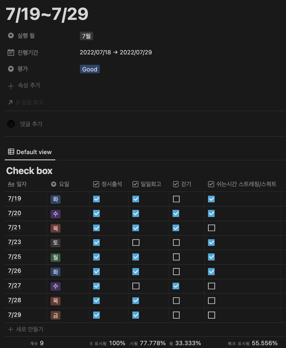 헤빗트래커는 그날그날 생활 습관은 어땠는지 확인하기 위해 확인해보려고 만든 데이터베이스였는데 꽤 괜찮았던 7월에 비해 8월이 너무나도 엉망이다.
